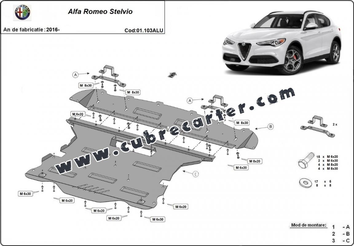 El cubre carter metalico es nuevo y se adapta perfectamente al Alfa Romeo Stelvio, con las siguientes versiones de motor / accionamiento: toate, fabricado entre 2016 y 2025. La placa protega los siguientes: motor, caja de cambios, radiador, parachoques delantero Está preparado de chapa de Aluminio de 3 mm. Los escudos son de aluminio, pero los soportes de fijación son de acero. Cerrojos, calces y todos los accesorios incluidos. Todas las placas son estrachadas con pintura de polvo anticorrosivo. Las placas del protección del motor son equipados con braceares soldados para resistir mejor a los impactos exteriores. |