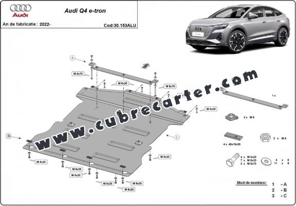 El cubre carter metalico es nuevo y se adapta perfectamente al Audi Q 4 e-tron, con las siguientes versiones de motor / accionamiento: toate, fabricado entre 2022 y 2025. La placa protega los siguientes: motor, caja de cambios, radiador Está preparado de chapa de Aluminio de 3 mm. Los escudos son de aluminio, pero los soportes de fijación son de acero. Cerrojos, calces y todos los accesorios incluidos. Todas las placas son estrachadas con pintura de polvo anticorrosivo. Las placas del protección del motor son equipados con braceares soldados para resistir mejor a los impactos exteriores. |