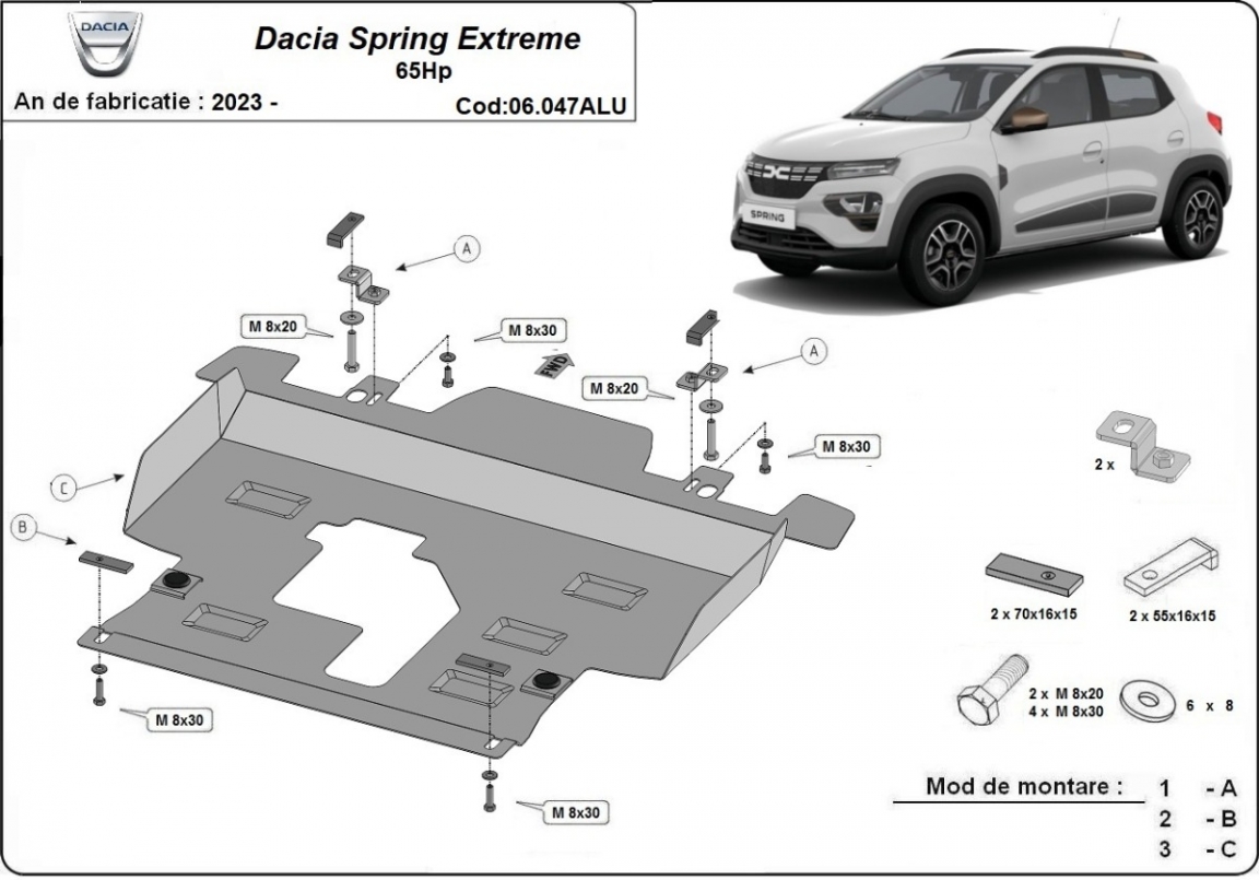 El cubre carter metalico es nuevo y se adapta perfectamente a todas las versiones de Dacia Spring fabricadas entre 2023 y 2026. La placa protega los siguientes: motor, caja de cambios, radiador Está preparado de chapa de Aluminio de 4 mm. Los escudos son de aluminio, pero los soportes de fijación son de acero. Cerrojos, calces y todos los accesorios incluidos. Todas las placas son estrachadas con pintura de polvo anticorrosivo. Las placas del protección del motor son equipados con braceares soldados para resistir mejor a los impactos exteriores. |