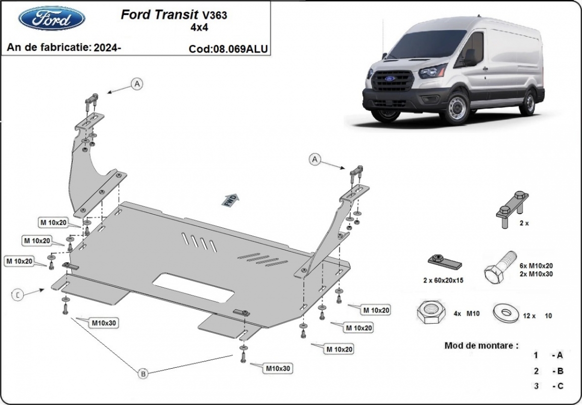 El cubre carter metalico es nuevo y se adapta perfectamente a todas las versiones de Ford Transit V363 4x4 fabricadas entre 2024 y 2026. La placa protega los siguientes: motor, caja de cambios, radiador Está preparado de chapa de Aluminio de 3 mm. Los escudos son de aluminio, pero los soportes de fijación son de acero. Cerrojos, calces y todos los accesorios incluidos. Todas las placas son estrachadas con pintura de polvo anticorrosivo. Las placas del protección del motor son equipados con braceares soldados para resistir mejor a los impactos exteriores. |