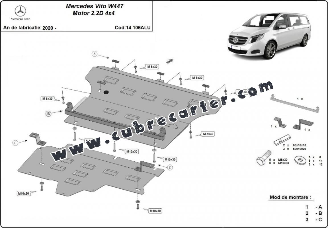 El cubre carter metalico es nuevo y se adapta perfectamente al Mercedes Vito W447, con las siguientes versiones de motor / accionamiento: toate, fabricado entre 2020 y 2025. La placa protega los siguientes: motor, caja de cambios, radiador Está preparado de chapa de Aluminio de 3 mm. Los escudos son de aluminio, pero los soportes de fijación son de acero. Cerrojos, calces y todos los accesorios incluidos. Todas las placas son estrachadas con pintura de polvo anticorrosivo. Las placas del protección del motor son equipados con braceares soldados para resistir mejor a los impactos exteriores. |