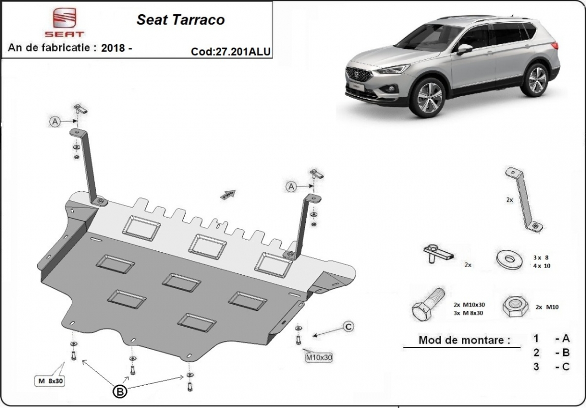 El cubre carter metalico es nuevo y se adapta perfectamente a todas las versiones de Seat Tarraco fabricadas entre 2018 y 2026. La placa protega los siguientes: motor, caja de cambios, radiador, parachoques delantero Está preparado de chapa de Aluminio de 3 mm. Los escudos son de aluminio, pero los soportes de fijación son de acero. Cerrojos, calces y todos los accesorios incluidos. Todas las placas son estrachadas con pintura de polvo anticorrosivo. Las placas del protección del motor son equipados con braceares soldados para resistir mejor a los impactos exteriores. |