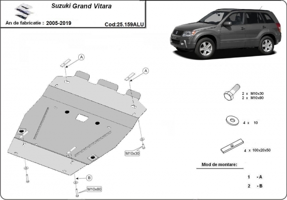 El cubre carter metalico es nuevo y se adapta perfectamente a todas las versiones de Suzuki Grand Vitara 2 fabricadas entre 2005 y 2019. La placa protega los siguientes: motor, radiador Está preparado de chapa de Aluminio de 3 mm. Los escudos son de aluminio, pero los soportes de fijación son de acero. Cerrojos, calces y todos los accesorios incluidos. Todas las placas son estrachadas con pintura de polvo anticorrosivo. Las placas del protección del motor son equipados con braceares soldados para resistir mejor a los impactos exteriores. |