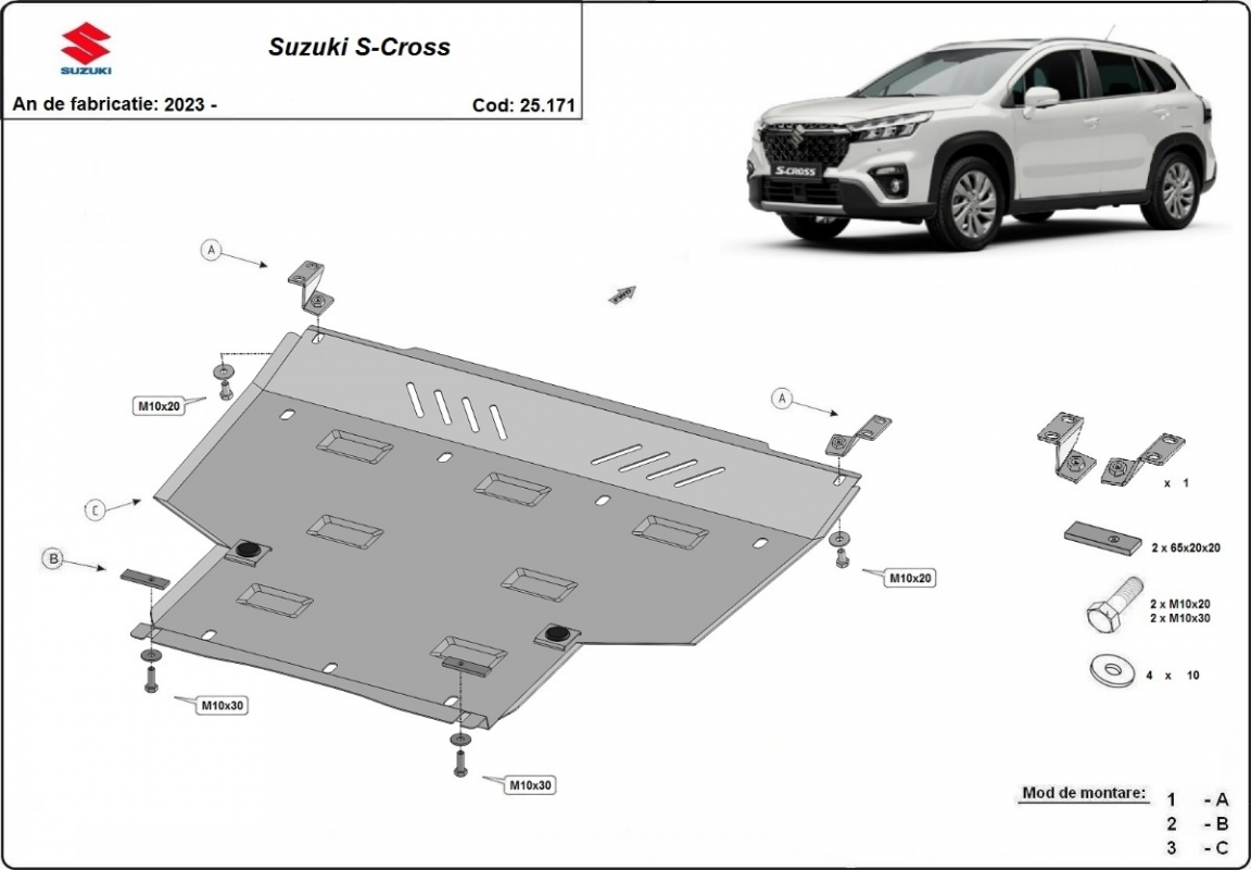 El cubre carter metalico es nuevo y se adapta perfectamente al Suzuki S-Cross, con las siguientes versiones de motor / accionamiento: Hybrid, fabricado entre 2023 y 2026. La placa protega los siguientes: motor, caja de cambios Está preparado de chapa de Aluminio de 4 mm. Los escudos son de aluminio, pero los soportes de fijación son de acero. Cerrojos, calces y todos los accesorios incluidos. Todas las placas son estrachadas con pintura de polvo anticorrosivo. Las placas del protección del motor son equipados con braceares soldados para resistir mejor a los impactos exteriores. |