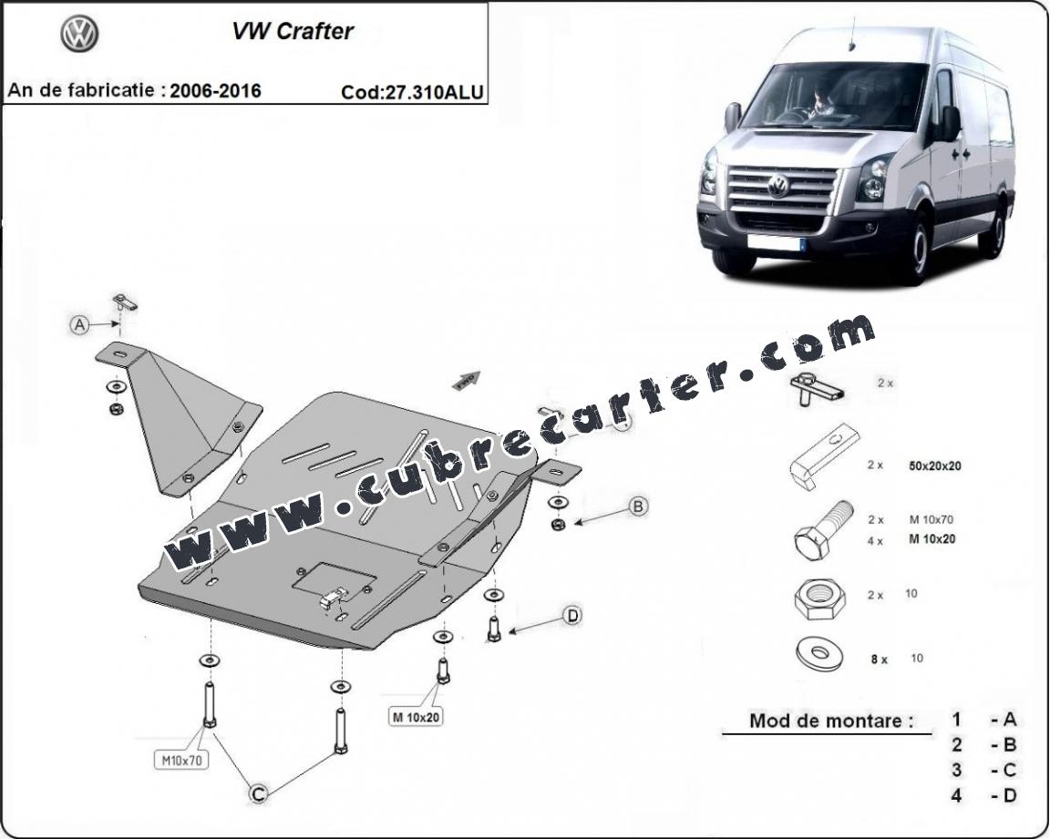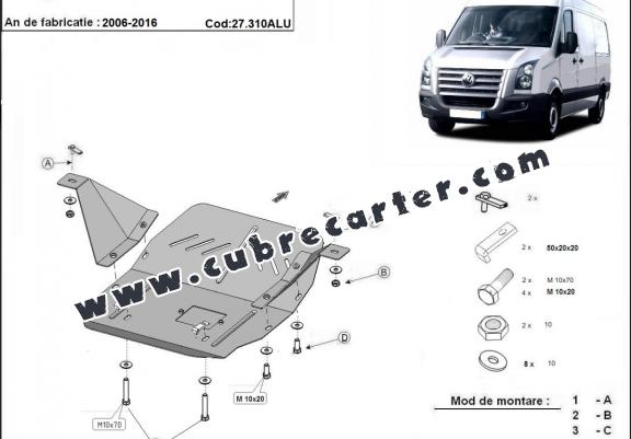 El cubre carter metalico es nuevo y se adapta perfectamente al Volkswagen Crafter, con las siguientes versiones de motor / accionamiento: toate, fabricado entre 2006 y 2016. La placa protega los siguientes: motor, caja de cambios Está preparado de chapa de Aluminio de 3 mm. Los escudos son de aluminio, pero los soportes de fijación son de acero. Cerrojos, calces y todos los accesorios incluidos. Todas las placas son estrachadas con pintura de polvo anticorrosivo. Las placas del protección del motor son equipados con braceares soldados para resistir mejor a los impactos exteriores. |