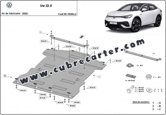 El cubre carter metalico es nuevo y se adapta perfectamente al Volkswagen ID.5, con las siguientes versiones de motor / accionamiento: toate, fabricado entre 2022 y 2025. La placa protega los siguientes: motor, caja de cambios, radiador Está preparado de chapa de Aluminio de 3 mm. Los escudos son de aluminio, pero los soportes de fijación son de acero. Cerrojos, calces y todos los accesorios incluidos. Todas las placas son estrachadas con pintura de polvo anticorrosivo. Las placas del protección del motor son equipados con braceares soldados para resistir mejor a los impactos exteriores. |