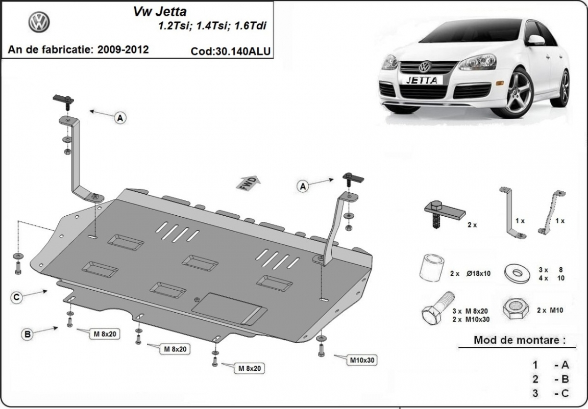 El cubre carter metalico es nuevo y se adapta perfectamente al VW Jetta, con las siguientes versiones de motor / accionamiento: 1.2Tsi, 1.4Tsi, 1.6Tdi, fabricado entre 2009 y 2012. La placa protega los siguientes: motor, caja de cambios, radiador Está preparado de chapa de Aluminio de 3 mm. Los escudos son de aluminio, pero los soportes de fijación son de acero. Cerrojos, calces y todos los accesorios incluidos. Todas las placas son estrachadas con pintura de polvo anticorrosivo. Las placas del protección del motor son equipados con braceares soldados para resistir mejor a los impactos exteriores. |