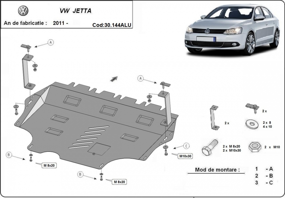El cubre carter metalico es nuevo y se adapta perfectamente a todas las versiones de VW Jetta fabricadas entre 2011 y 2017. La placa protega los siguientes: motor, caja de cambios, radiador Está preparado de chapa de Aluminio de 3 mm. Los escudos son de aluminio, pero los soportes de fijación son de acero. Cerrojos, calces y todos los accesorios incluidos. Todas las placas son estrachadas con pintura de polvo anticorrosivo. Las placas del protección del motor son equipados con braceares soldados para resistir mejor a los impactos exteriores. |