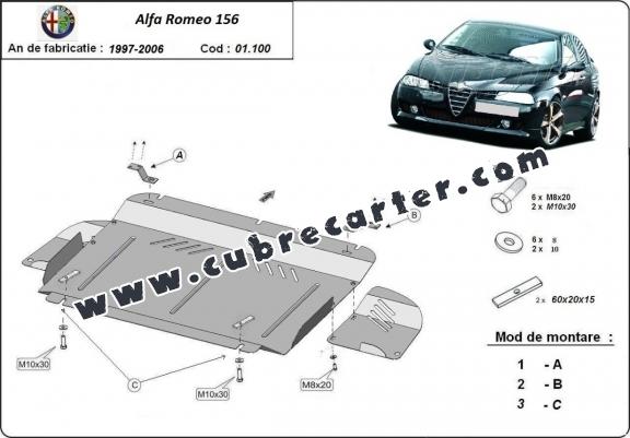 El cubre carter metalico es nuevo y se adapta perfectamente al Alfa Romeo 156, con las siguientes versiones de motor / accionamiento: toate, fabricado entre 1997 y 2003. La placa protega los siguientes: motor, caja de cambios, radiador Está preparado de chapa de Acero de 2 mm. Cerrojos, calces y todos los accesorios incluidos. Todas las placas son estrachadas con pintura de polvo anticorrosivo. Las placas del protección del motor son equipados con braceares soldados para resistir mejor a los impactos exteriores. |
