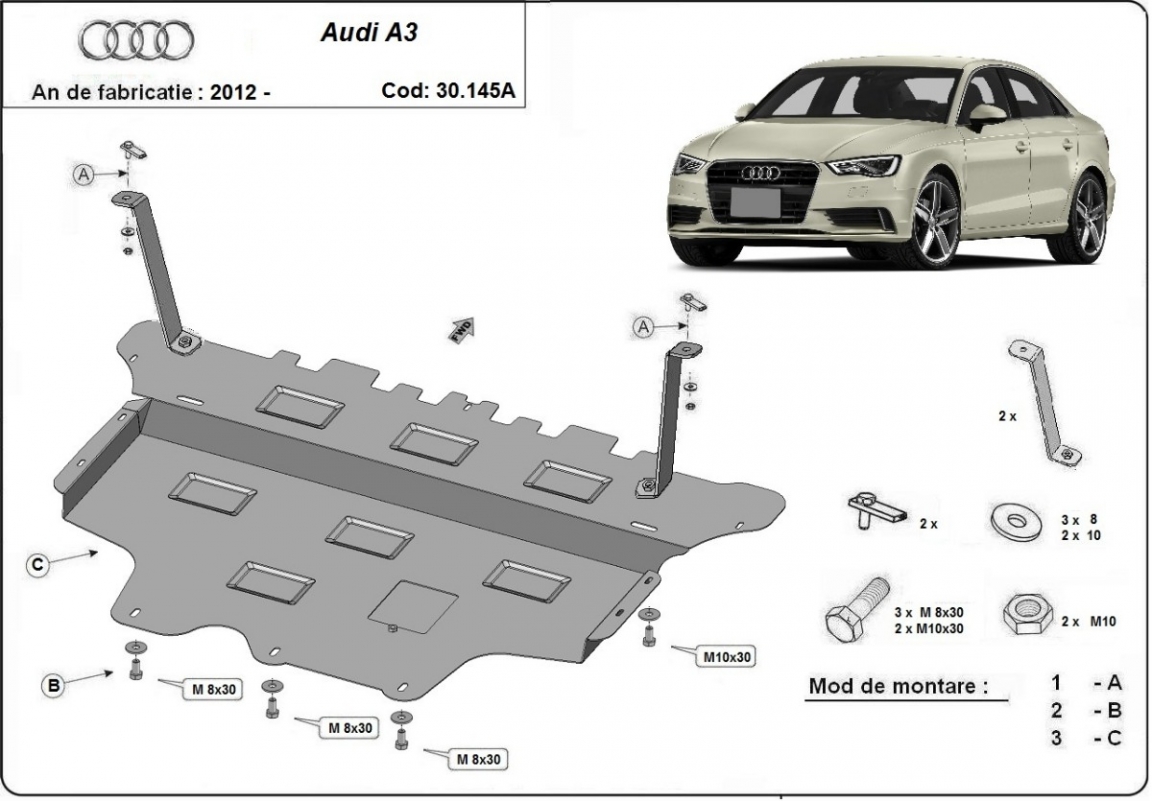 El cubre carter metalico es nuevo y se adapta perfectamente a todas las versiones de Audi A3 fabricadas entre 2012 y 2020. La placa protega los siguientes: motor, caja de cambios, radiador, parachoques delantero Está preparado de chapa de Acero de 2 mm. Cerrojos, calces y todos los accesorios incluidos. Todas las placas son estrachadas con pintura de polvo anticorrosivo. Las placas del protección del motor son equipados con braceares soldados para resistir mejor a los impactos exteriores. |