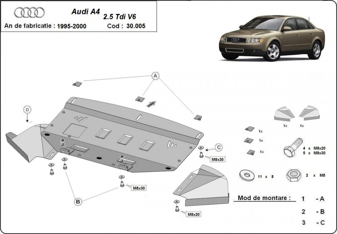 El cubre carter metalico es nuevo y se adapta perfectamente al Audi A4 B5, con las siguientes versiones de motor / accionamiento: petrol V6, 2.6, 2.8, diesel - 2.5 D, fabricado entre 1997 y 2000. La placa protega los siguientes: motor, radiador, parachoques delantero Montada con salida de petróleo descendido así que no es necesario el cambio del petróleo cuando se quita la placa. Está preparado de chapa de Acero de 2 mm. Cerrojos, calces y todos los accesorios incluidos. Todas las placas son estrachadas con pintura de polvo anticorrosivo. Las placas del protección del motor son equipados con braceares soldados para resistir mejor a los impactos exteriores. |