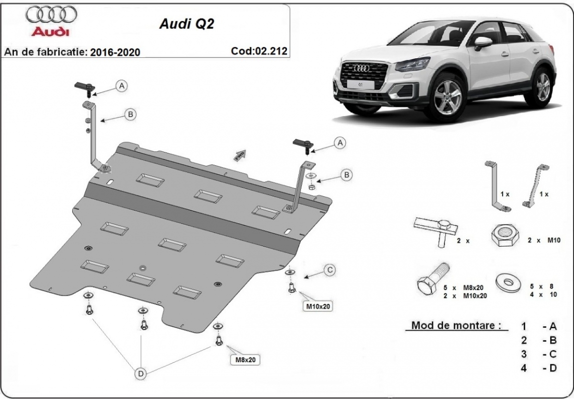 El cubre carter metalico es nuevo y se adapta perfectamente a todas las versiones de Audi Q2 fabricadas entre 2016 y 2020. La placa protega los siguientes: motor, caja de cambios, radiador Está preparado de chapa de Acero de 2 mm. Cerrojos, calces y todos los accesorios incluidos. Todas las placas son estrachadas con pintura de polvo anticorrosivo. Las placas del protección del motor son equipados con braceares soldados para resistir mejor a los impactos exteriores. |