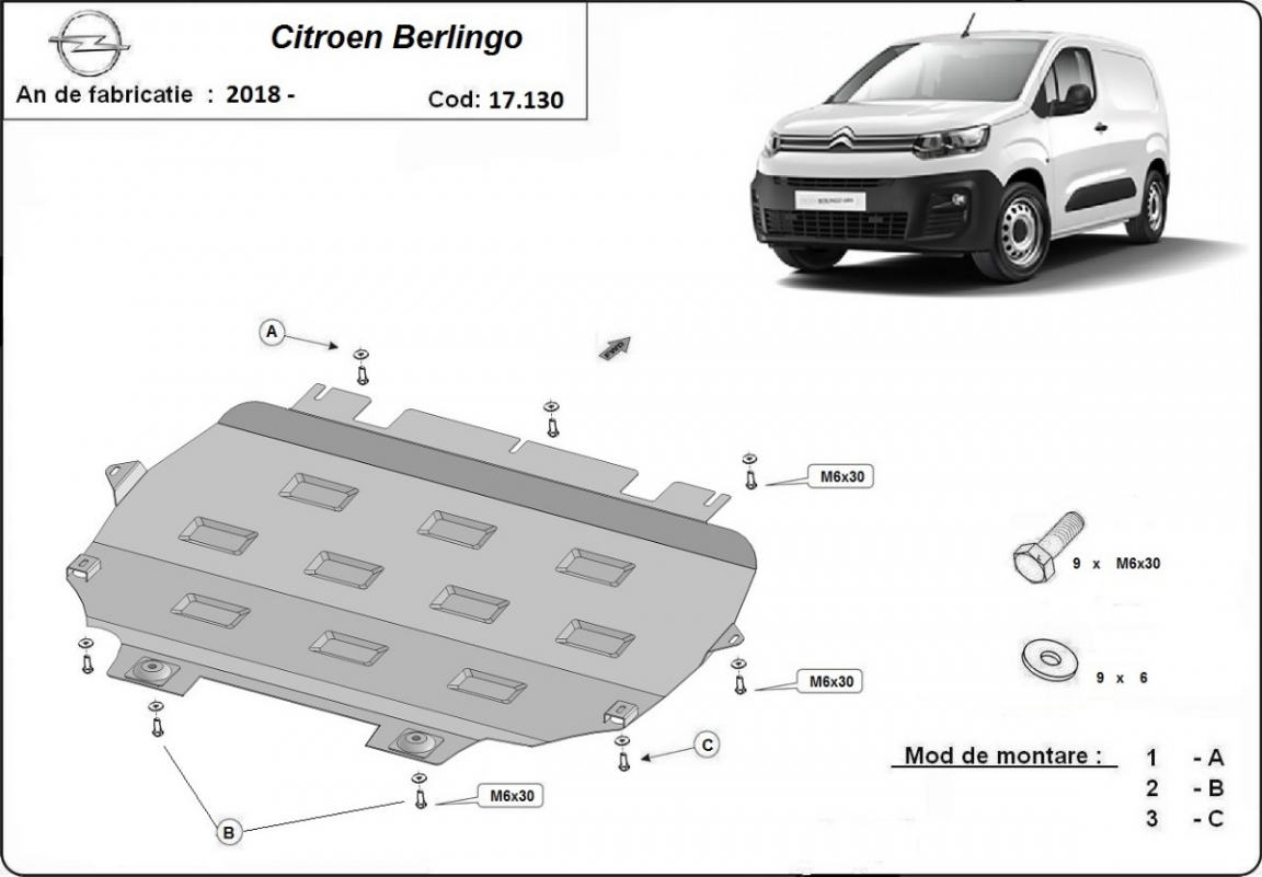 El cubre carter metalico es nuevo y se adapta perfectamente a todas las versiones de Citroen Berlingo fabricadas entre 2018 y 2026. La placa protega los siguientes: motor, caja de cambios, radiador Está preparado de chapa de Acero de 2 mm. Cerrojos, calces y todos los accesorios incluidos. Todas las placas son estrachadas con pintura de polvo anticorrosivo. Las placas del protección del motor son equipados con braceares soldados para resistir mejor a los impactos exteriores. |