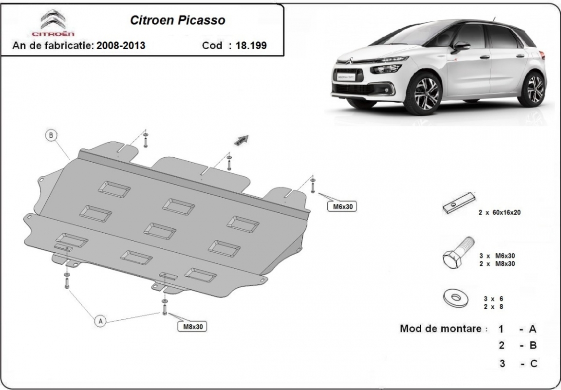 El cubre carter metalico es nuevo y se adapta perfectamente a todas las versiones de Citroen C4 Picasso fabricadas entre 2008 y 2013. La placa protega los siguientes: motor, caja de cambios, radiador Está preparado de chapa de Acero de 2 mm. Cerrojos, calces y todos los accesorios incluidos. Todas las placas son estrachadas con pintura de polvo anticorrosivo. Las placas del protección del motor son equipados con braceares soldados para resistir mejor a los impactos exteriores. |