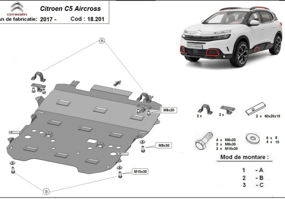 El cubre carter metalico es nuevo y se adapta perfectamente a todas las versiones de Citroen C5 Aircross fabricadas entre 2017 y 2026. La placa protega los siguientes: motor, caja de cambios, radiador, parachoques delantero Está preparado de chapa de Acero de 2 mm. Cerrojos, calces y todos los accesorios incluidos. Todas las placas son estrachadas con pintura de polvo anticorrosivo. Las placas del protección del motor son equipados con braceares soldados para resistir mejor a los impactos exteriores. |