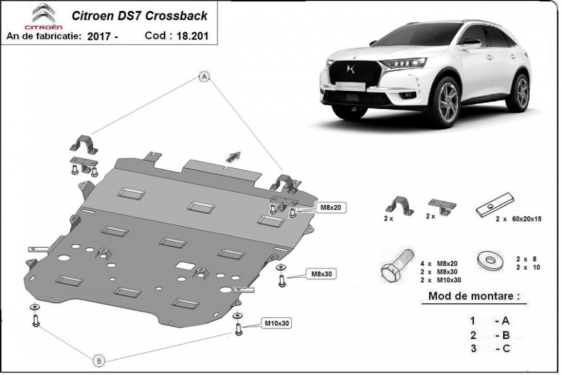 El cubre carter metalico es nuevo y se adapta perfectamente a todas las versiones de Citroen DS7 Crossback fabricadas entre 2017 y 2026. La placa protega los siguientes: motor, caja de cambios, radiador, parachoques delantero Está preparado de chapa de Acero de 2 mm. Cerrojos, calces y todos los accesorios incluidos. Todas las placas son estrachadas con pintura de polvo anticorrosivo. Las placas del protección del motor son equipados con braceares soldados para resistir mejor a los impactos exteriores. |