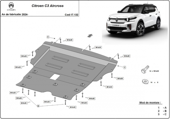 El cubre carter metalico es nuevo y se adapta perfectamente a todas las versiones de Citroen C3 Aircross fabricadas entre 2024 y 2026. La placa protega los siguientes: motor, caja de cambios Está preparado de chapa de Acero de 2 mm. Cerrojos, calces y todos los accesorios incluidos. Todas las placas son estrachadas con pintura de polvo anticorrosivo. Las placas del protección del motor son equipados con braceares soldados para resistir mejor a los impactos exteriores. |