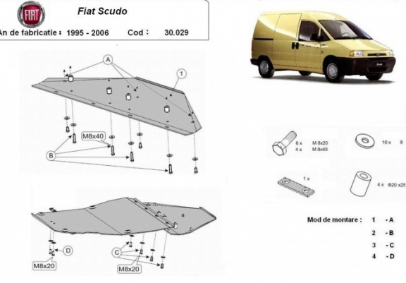 El cubre carter metalico es nuevo y se adapta perfectamente a todas las versiones de Fiat Scudo fabricadas entre 1995 y 2006. La placa protega los siguientes: motor, caja de cambios, radiador, parachoques delantero Está preparado de chapa de Acero de 2 mm. Cerrojos, calces y todos los accesorios incluidos. Todas las placas son estrachadas con pintura de polvo anticorrosivo. Las placas del protección del motor son equipados con braceares soldados para resistir mejor a los impactos exteriores. |