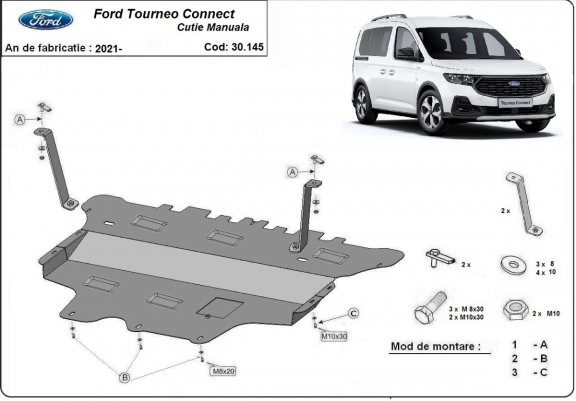 El cubre carter metalico es nuevo y se adapta perfectamente a todas las versiones de Ford Tourneo Connect fabricadas entre 2021 y 2026. La placa protega los siguientes: motor, caja de cambios, radiador, parachoques delantero Está preparado de chapa de Acero de 2 mm. Cerrojos, calces y todos los accesorios incluidos. Todas las placas son estrachadas con pintura de polvo anticorrosivo. Las placas del protección del motor son equipados con braceares soldados para resistir mejor a los impactos exteriores. |