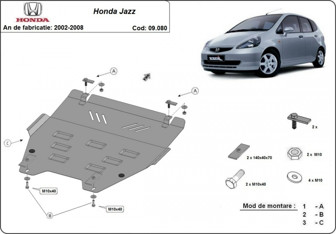 El cubre carter metalico es nuevo y se adapta perfectamente a todas las versiones de Honda Jazz fabricadas entre 2002 y 2008. La placa protega los siguientes: motor, radiador, parachoques delantero Está preparado de chapa de Acero de 2 mm. Cerrojos, calces y todos los accesorios incluidos. Todas las placas son estrachadas con pintura de polvo anticorrosivo. Las placas del protección del motor son equipados con braceares soldados para resistir mejor a los impactos exteriores. |