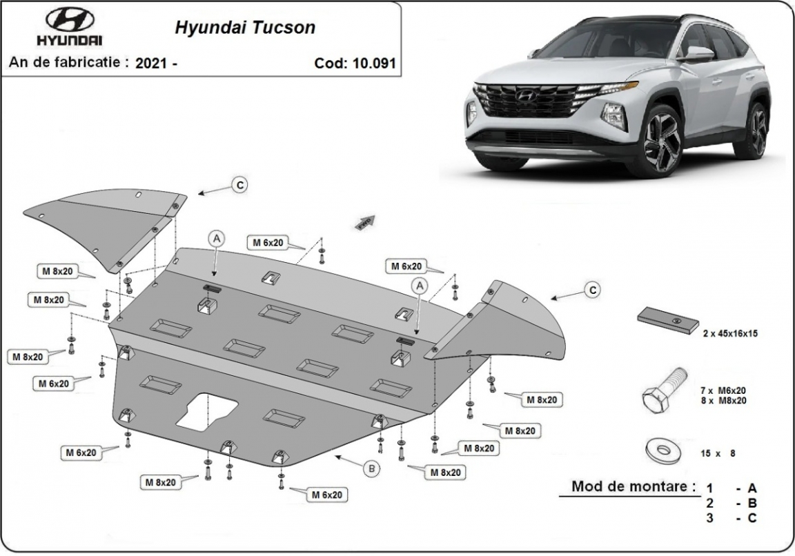 El cubre carter metalico es nuevo y se adapta perfectamente a todas las versiones de Hyundai Tucson fabricadas entre 2021 y 2026. La placa protega los siguientes: motor, caja de cambios, radiador, parachoques delantero Está preparado de chapa de Acero de 2 mm. Cerrojos, calces y todos los accesorios incluidos. Todas las placas son estrachadas con pintura de polvo anticorrosivo. Las placas del protección del motor son equipados con braceares soldados para resistir mejor a los impactos exteriores. |