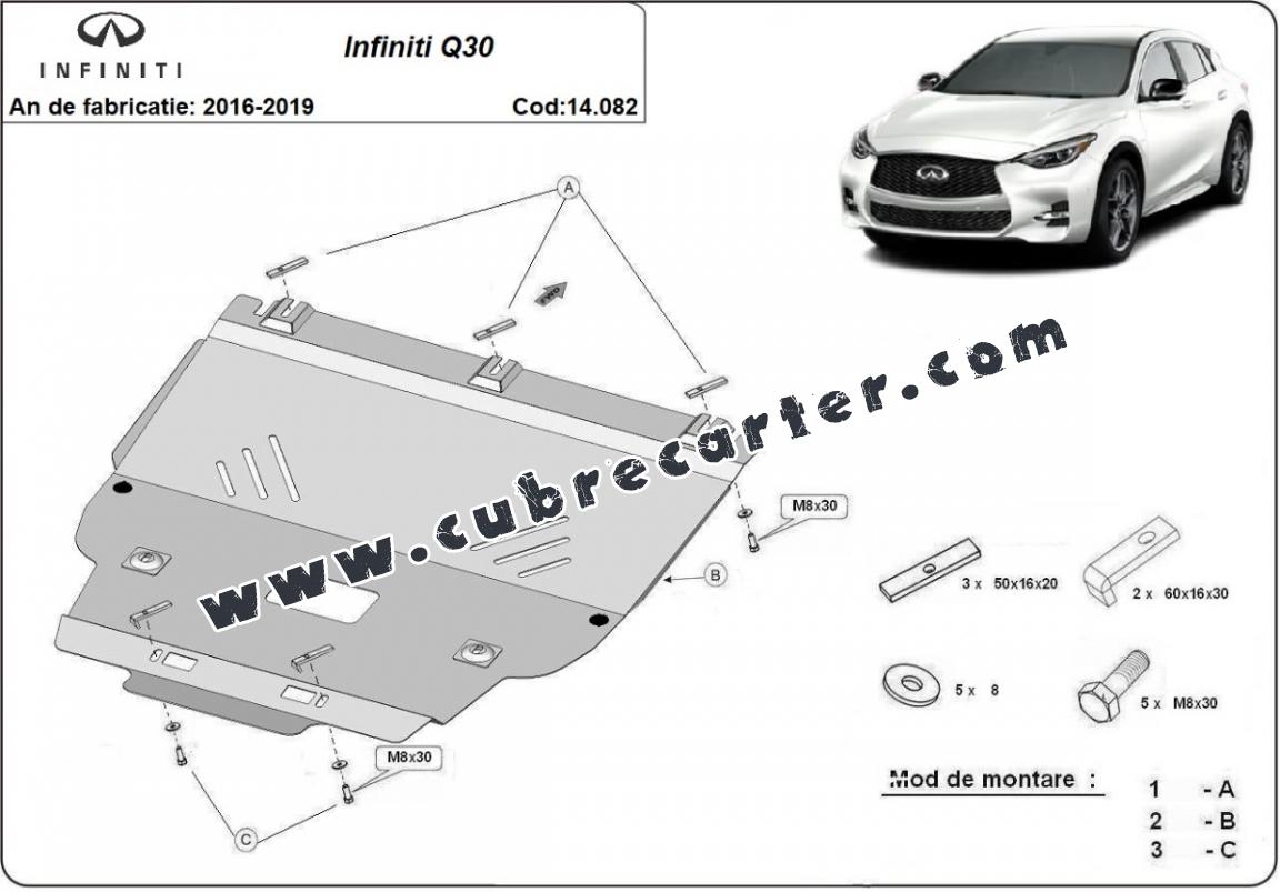 El cubre carter metalico es nuevo y se adapta perfectamente al Infiniti Q30, con las siguientes versiones de motor / accionamiento: toate, fabricado entre 2016 y 2019. La placa protega los siguientes: motor, caja de cambios Está preparado de chapa de Acero de 2 mm. Cerrojos, calces y todos los accesorios incluidos. Todas las placas son estrachadas con pintura de polvo anticorrosivo. Las placas del protección del motor son equipados con braceares soldados para resistir mejor a los impactos exteriores. |