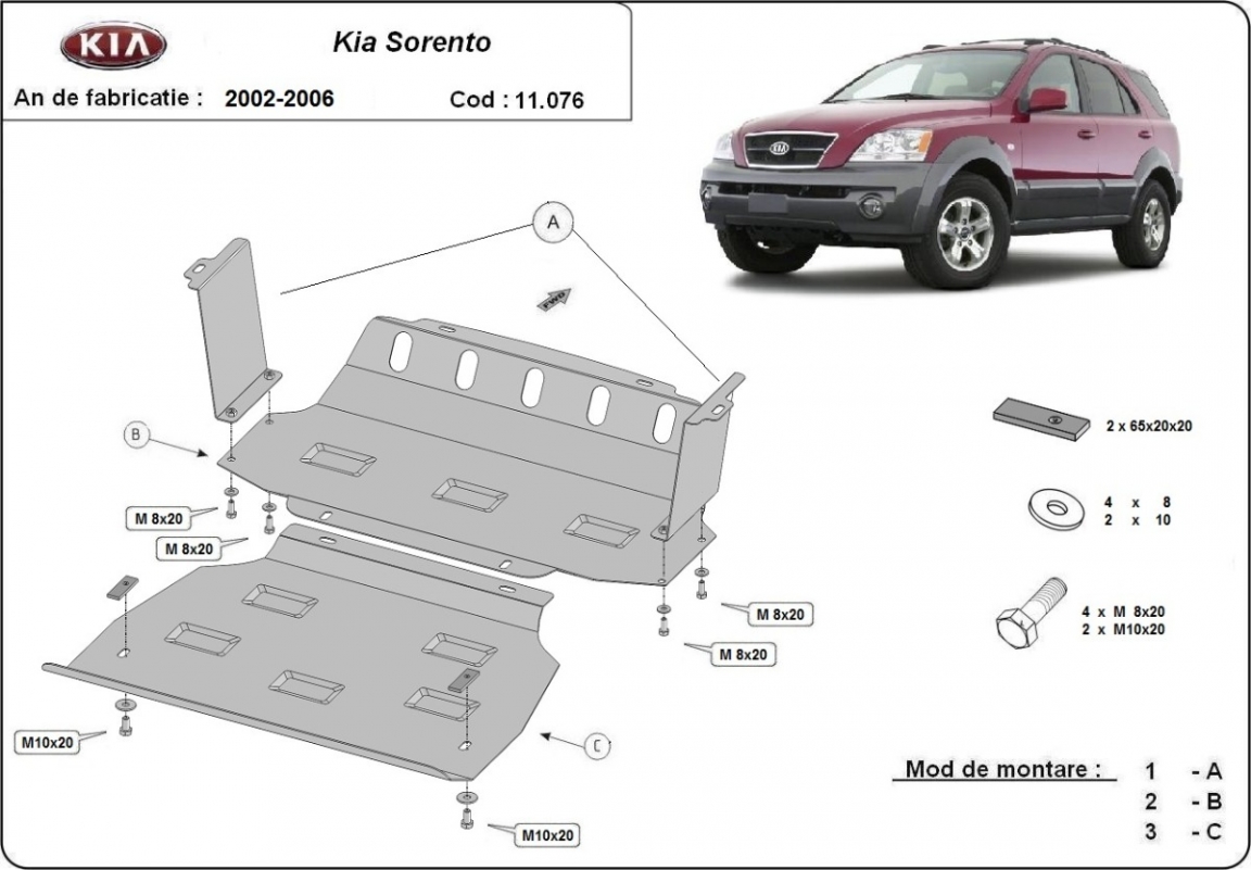 El cubre carter metalico es nuevo y se adapta perfectamente a todas las versiones de Kia Sorento fabricadas entre 2002 y 2006. La placa protega los siguientes: motor, radiador, parachoques delantero Está preparado de chapa de Acero de 2 mm. Cerrojos, calces y todos los accesorios incluidos. Todas las placas son estrachadas con pintura de polvo anticorrosivo. Las placas del protección del motor son equipados con braceares soldados para resistir mejor a los impactos exteriores. |