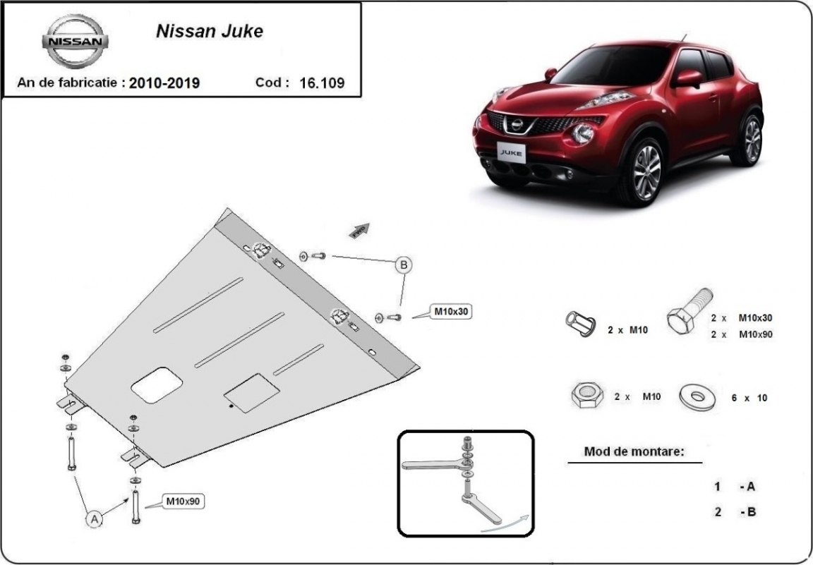El cubre carter metalico es nuevo y se adapta perfectamente a todas las versiones de Nissan Juke fabricadas entre 2010 y 2019. La placa protega los siguientes: motor, caja de cambios, radiador Montada con salida de petróleo descendido así que no es necesario el cambio del petróleo cuando se quita la placa. Está preparado de chapa de Acero de 2,5 mm. Cerrojos, calces y todos los accesorios incluidos. Todas las placas son estrachadas con pintura de polvo anticorrosivo. Las placas del protección del motor son equipados con braceares soldados para resistir mejor a los impactos exteriores. |