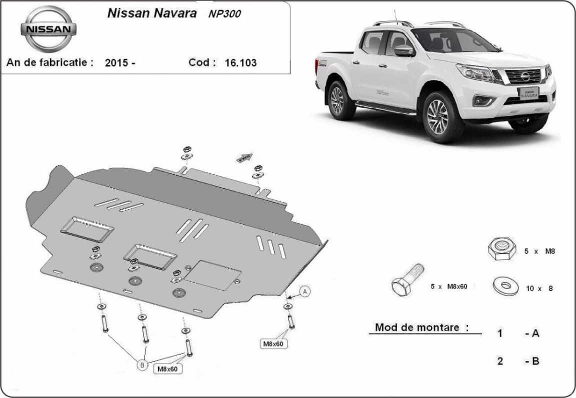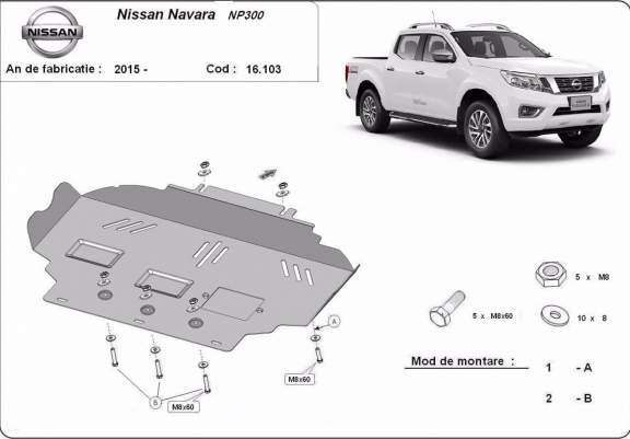 El cubre carter metalico es nuevo y se adapta perfectamente a todas las versiones de Nissan Navara NP300 fabricadas entre 2015 y 2021. La placa protega los siguientes: motor Montada con salida de petróleo descendido así que no es necesario el cambio del petróleo cuando se quita la placa. Está preparado de chapa de Acero de 2.5 mm. Cerrojos, calces y todos los accesorios incluidos. Todas las placas son estrachadas con pintura de polvo anticorrosivo. Las placas del protección del motor son equipados con braceares soldados para resistir mejor a los impactos exteriores. |