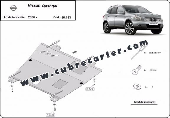 El cubre carter metalico es nuevo y se adapta perfectamente al Nissan Qashqai, con las siguientes versiones de motor / accionamiento: 1.6, 2.0, fabricado entre 2006 y 2013. La placa protega los siguientes: motor, caja de cambios Montada con salida de petróleo descendido así que no es necesario el cambio del petróleo cuando se quita la placa. Está preparado de chapa de Acero de 2 mm. Cerrojos, calces y todos los accesorios incluidos. Todas las placas son estrachadas con pintura de polvo anticorrosivo. Las placas del protección del motor son equipados con braceares soldados para resistir mejor a los impactos exteriores. |