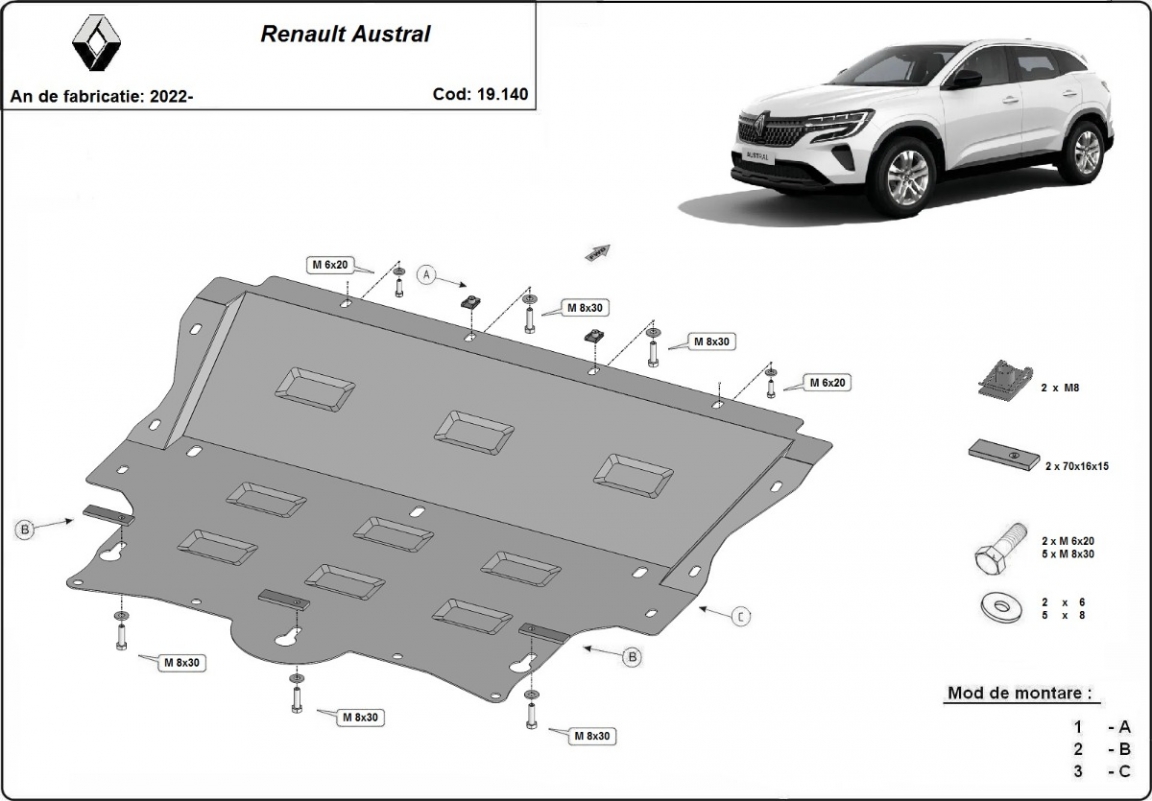 El cubre carter metalico es nuevo y se adapta perfectamente a todas las versiones de Renault Austral fabricadas entre 2022 y 2026. La placa protega los siguientes: motor, caja de cambios, radiador Está preparado de chapa de Acero de 2 mm. Cerrojos, calces y todos los accesorios incluidos. Todas las placas son estrachadas con pintura de polvo anticorrosivo. Las placas del protección del motor son equipados con braceares soldados para resistir mejor a los impactos exteriores. |