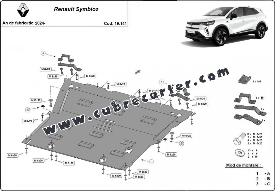 El cubre carter metalico es nuevo y se adapta perfectamente al Renault Symbioz , con las siguientes versiones de motor / accionamiento: toate, fabricado entre 2024 y 2025. La placa protega los siguientes: motor, caja de cambios, radiador Está preparado de chapa de Acero de 2 mm. Cerrojos, calces y todos los accesorios incluidos. Todas las placas son estrachadas con pintura de polvo anticorrosivo. Las placas del protección del motor son equipados con braceares soldados para resistir mejor a los impactos exteriores. |