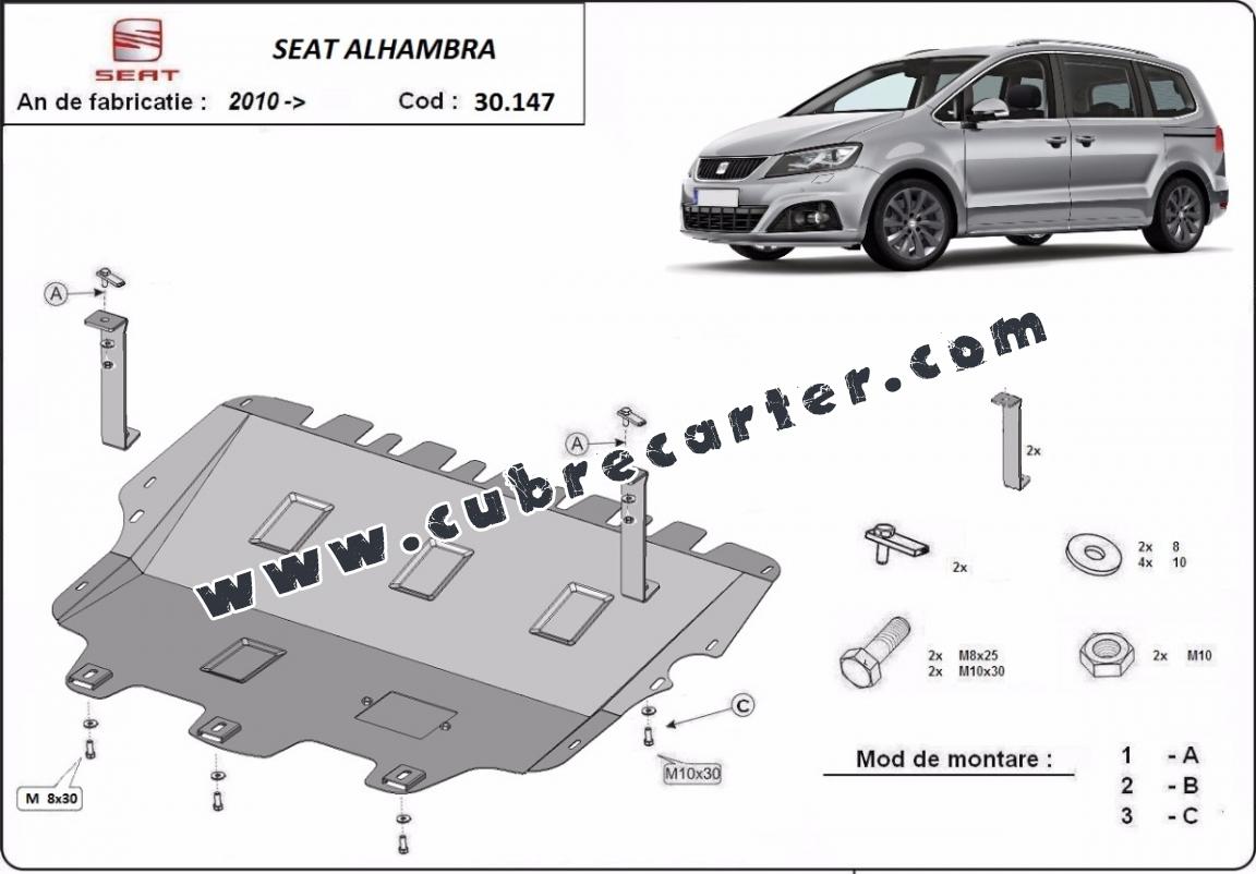El cubre carter metalico es nuevo y se adapta perfectamente al Seat Alhambra, con las siguientes versiones de motor / accionamiento: toate, fabricado entre 2010 y 2020. La placa protega los siguientes: motor, caja de cambios, radiador, parachoques delantero Está preparado de chapa de Acero de 2 mm. Cerrojos, calces y todos los accesorios incluidos. Todas las placas son estrachadas con pintura de polvo anticorrosivo. Las placas del protección del motor son equipados con braceares soldados para resistir mejor a los impactos exteriores. |