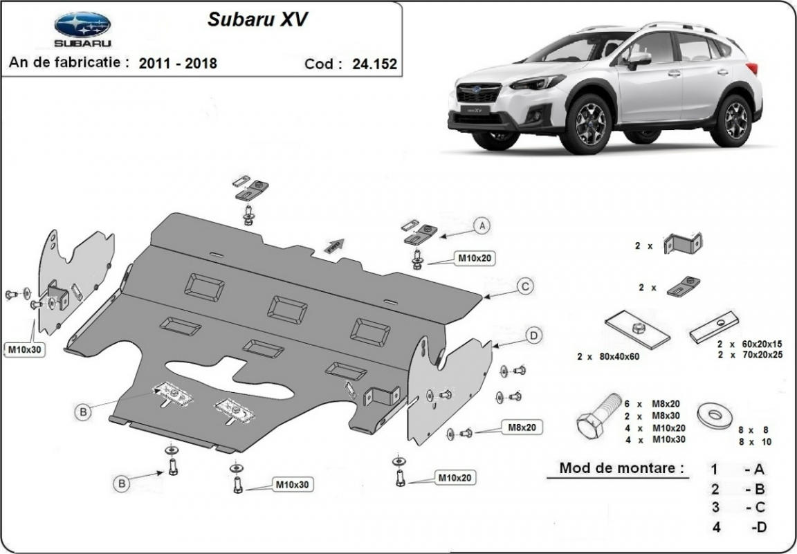 El cubre carter metalico es nuevo y se adapta perfectamente a todas las versiones de Subaru XV fabricadas entre 2011 y 2017. La placa protega los siguientes: motor, radiador, parachoques delantero Está preparado de chapa de Acero de 2 mm. Cerrojos, calces y todos los accesorios incluidos. Todas las placas son estrachadas con pintura de polvo anticorrosivo. Las placas del protección del motor son equipados con braceares soldados para resistir mejor a los impactos exteriores. |