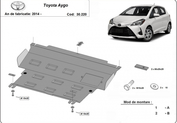 El cubre carter metalico es nuevo y se adapta perfectamente a todas las versiones de Toyota Aygo AB40 fabricadas entre 2014 y 2022. La placa protega los siguientes: motor, caja de cambios, radiador Montada con salida de petróleo descendido así que no es necesario el cambio del petróleo cuando se quita la placa. Está preparado de chapa de Acero de 2 mm. Cerrojos, calces y todos los accesorios incluidos. Todas las placas son estrachadas con pintura de polvo anticorrosivo. Las placas del protección del motor son equipados con braceares soldados para resistir mejor a los impactos exteriores. |