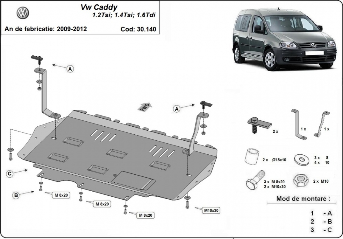 El cubre carter metalico es nuevo y se adapta perfectamente al Volkswagen Caddy , con las siguientes versiones de motor / accionamiento: 1.2,1.4,TSI, 1.6TDI, , fabricado entre 2010 y 2012. La placa protega los siguientes: motor, caja de cambios, radiador Montada con salida de petróleo descendido así que no es necesario el cambio del petróleo cuando se quita la placa. Está preparado de chapa de Acero de 2 mm. Cerrojos, calces y todos los accesorios incluidos. Todas las placas son estrachadas con pintura de polvo anticorrosivo. Las placas del protección del motor son equipados con braceares soldados para resistir mejor a los impactos exteriores. |