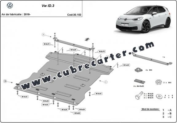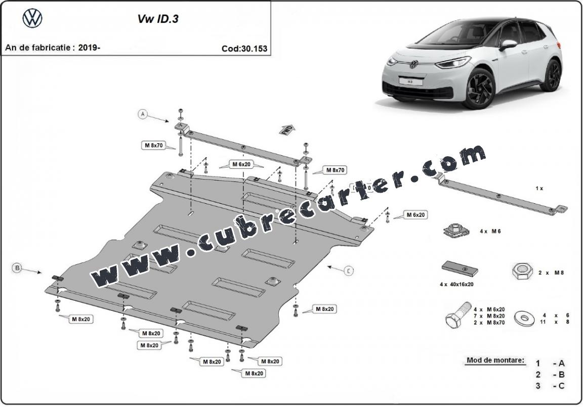 El cubre carter metalico es nuevo y se adapta perfectamente al Volkswagen ID 3, con las siguientes versiones de motor / accionamiento: toate, fabricado entre 2019 y 2025. La placa protega los siguientes: motor, caja de cambios, radiador Está preparado de chapa de Acero de 2 mm. Cerrojos, calces y todos los accesorios incluidos. Todas las placas son estrachadas con pintura de polvo anticorrosivo. Las placas del protección del motor son equipados con braceares soldados para resistir mejor a los impactos exteriores. |