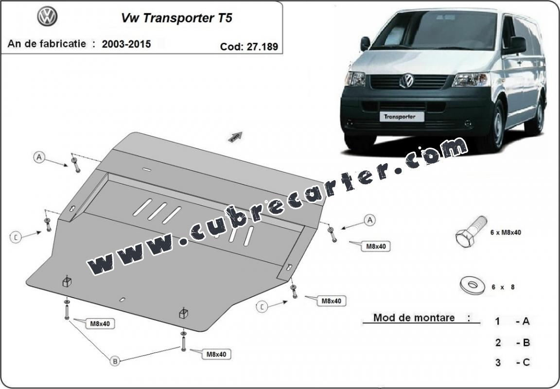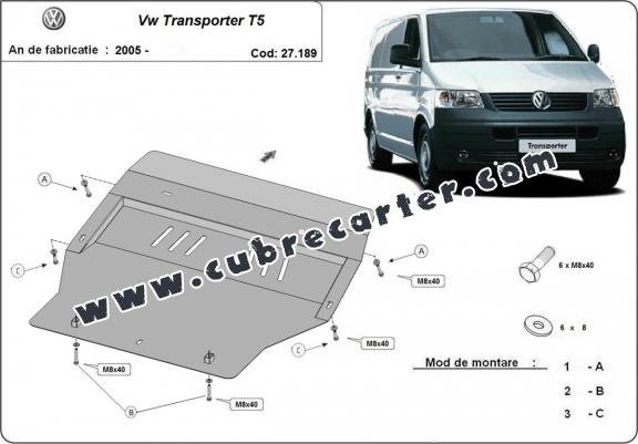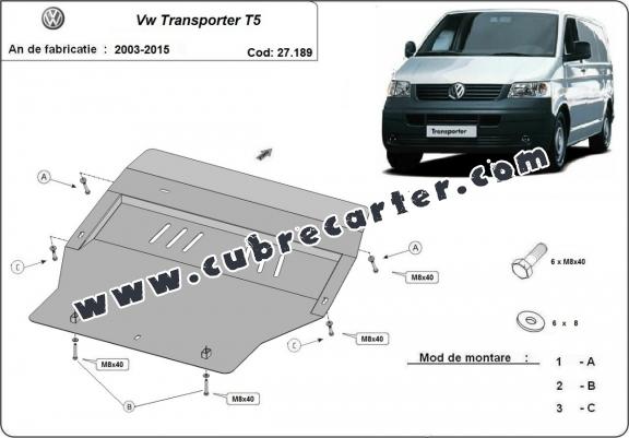 El cubre carter metalico es nuevo y se adapta perfectamente al Volkswagen Transporter T5, con las siguientes versiones de motor / accionamiento: toate, fabricado entre 2003 y 2015. La placa protega los siguientes: motor, caja de cambios, radiador, parachoques delantero Está preparado de chapa de Acero de 2 mm. Cerrojos, calces y todos los accesorios incluidos. Todas las placas son estrachadas con pintura de polvo anticorrosivo. Las placas del protección del motor son equipados con braceares soldados para resistir mejor a los impactos exteriores. |