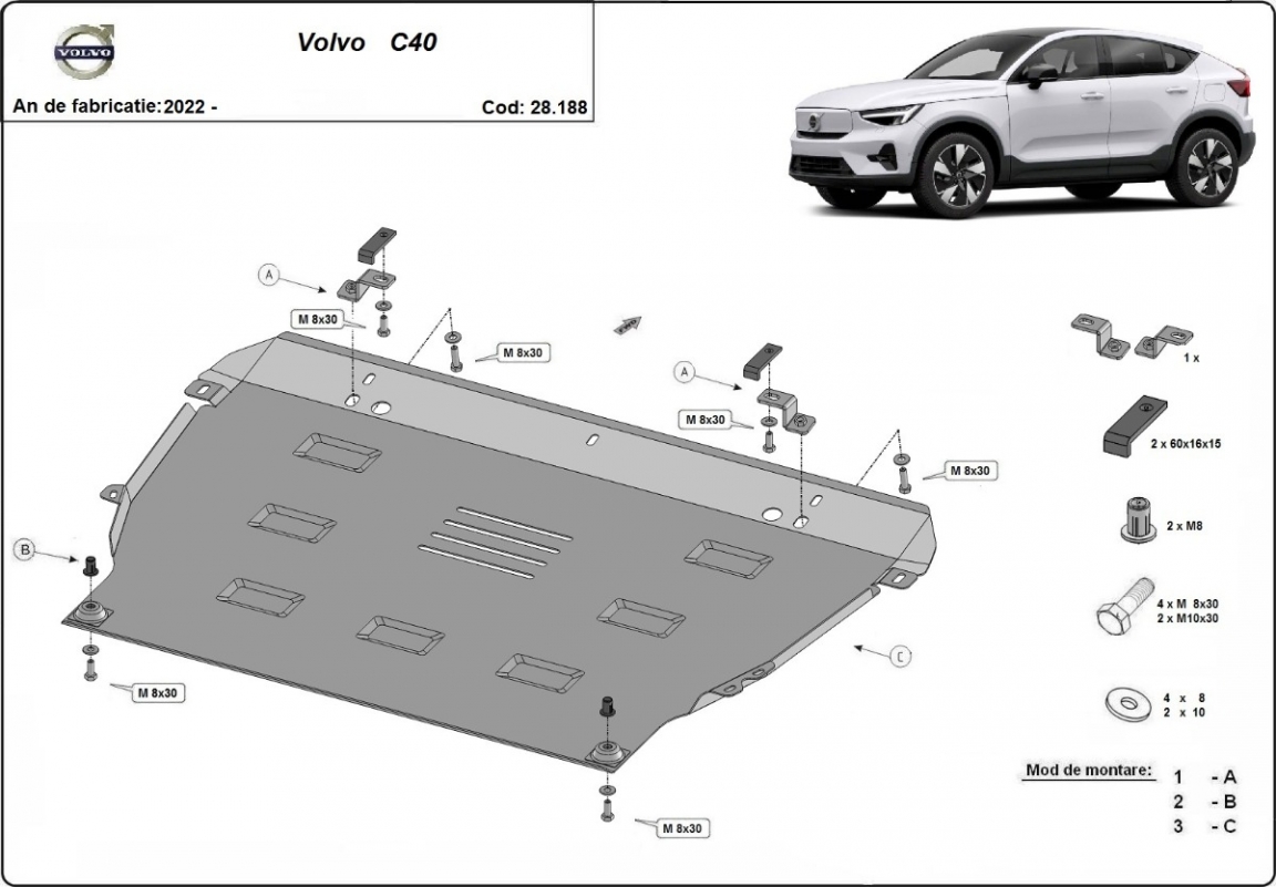 El cubre carter metalico es nuevo y se adapta perfectamente a todas las versiones de Volvo C40 fabricadas entre 2022 y 2026. La placa protega los siguientes: motor, caja de cambios, radiador Está preparado de chapa de Acero de 2 mm. Cerrojos, calces y todos los accesorios incluidos. Todas las placas son estrachadas con pintura de polvo anticorrosivo. Las placas del protección del motor son equipados con braceares soldados para resistir mejor a los impactos exteriores. |