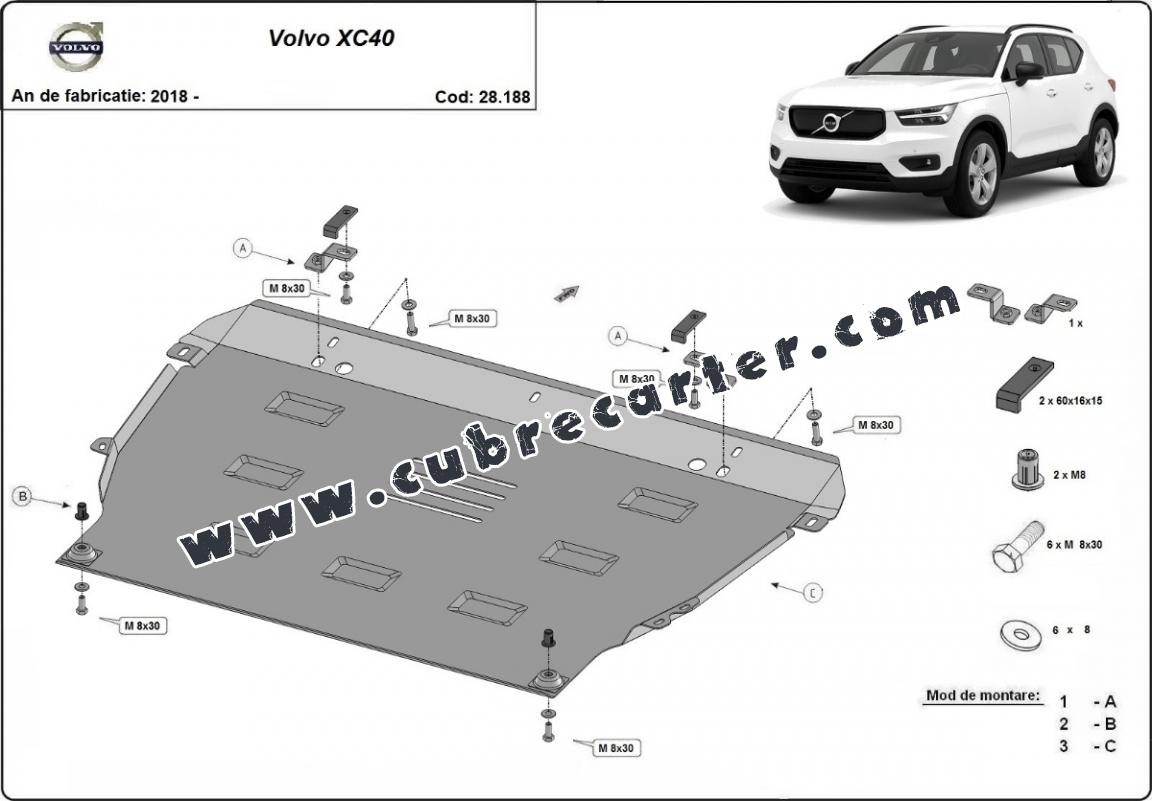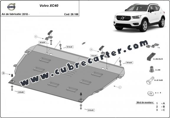 El cubre carter metalico es nuevo y se adapta perfectamente al Volvo XC40, con las siguientes versiones de motor / accionamiento: toate, fabricado entre 2018 y 2025. La placa protega los siguientes: motor, caja de cambios, radiador Está preparado de chapa de Acero de 2 mm. Cerrojos, calces y todos los accesorios incluidos. Todas las placas son estrachadas con pintura de polvo anticorrosivo. Las placas del protección del motor son equipados con braceares soldados para resistir mejor a los impactos exteriores. |