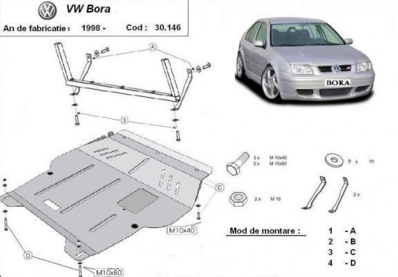 El cubre carter metalico es nuevo y se adapta perfectamente a todas las versiones de VW Bora fabricadas entre 1998 y 2006. La placa protega los siguientes: motor, caja de cambios, radiador, parachoques delantero Montada con salida de petróleo descendido así que no es necesario el cambio del petróleo cuando se quita la placa. Está preparado de chapa de Acero de 2 mm. Cerrojos, calces y todos los accesorios incluidos. Todas las placas son estrachadas con pintura de polvo anticorrosivo. Las placas del protección del motor son equipados con braceares soldados para resistir mejor a los impactos exteriores. |