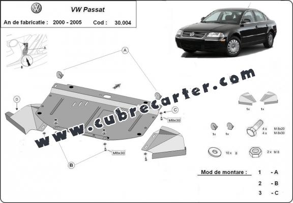 El cubre carter metalico es nuevo y se adapta perfectamente al VW Passat B5.5, con las siguientes versiones de motor / accionamiento: 1.6, 1.8 , 1.9 PD TDI, fabricado entre 2001 y 2005. La placa protega los siguientes: motor, radiador, parachoques delantero Montada con salida de petróleo descendido así que no es necesario el cambio del petróleo cuando se quita la placa. Está preparado de chapa de Acero de 2 mm. Cerrojos, calces y todos los accesorios incluidos. Todas las placas son estrachadas con pintura de polvo anticorrosivo. Las placas del protección del motor son equipados con braceares soldados para resistir mejor a los impactos exteriores. |