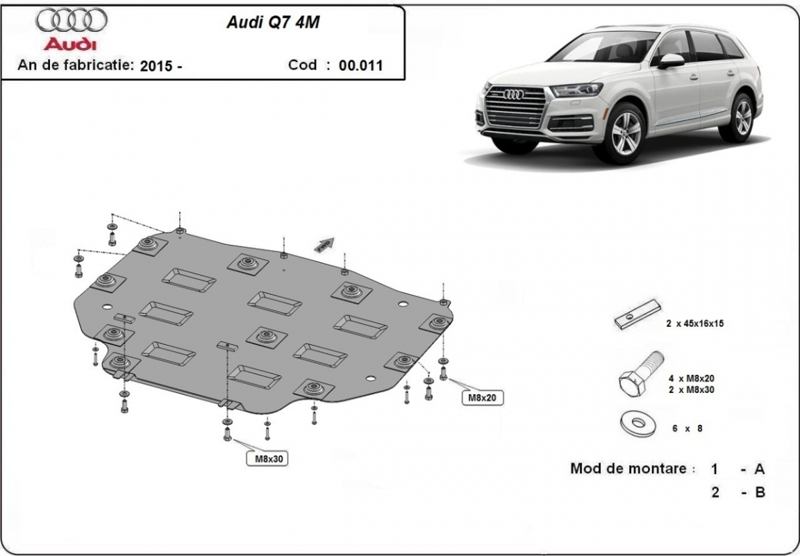El cubre carter metalico es nuevo y se adapta perfectamente a todas las versiones de Audi Q7 fabricadas entre 2015 y 2026. La placa protega los siguientes: caja de cambios Está preparado de chapa de Acero de 2 mm. Cerrojos, calces y todos los accesorios incluidos. Todas las placas son estrachadas con pintura de polvo anticorrosivo. Las placas del protección del motor son equipados con braceares soldados para resistir mejor a los impactos exteriores. |
