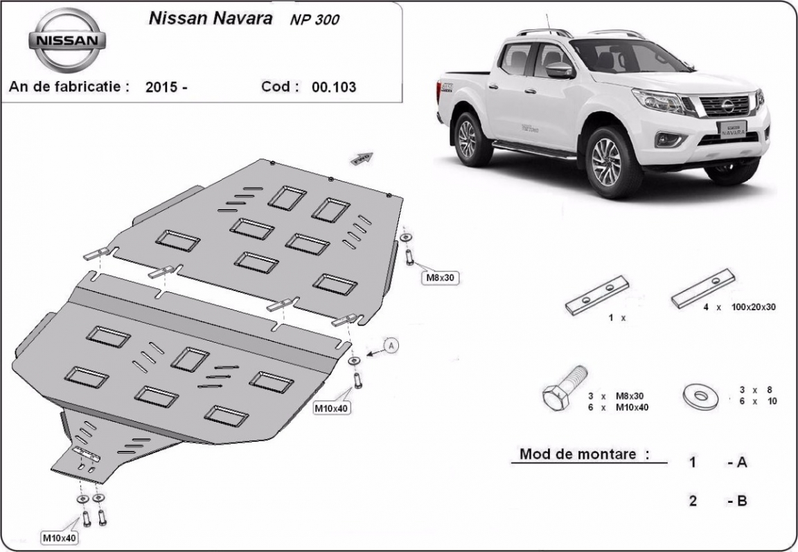 El cubre carter metalico es nuevo y se adapta perfectamente a todas las versiones de Nissan Navara NP300 fabricadas entre 2015 y 2021. La placa protega los siguientes: caja de cambios, transferir caso Está preparado de chapa de Acero de 3 mm. Cerrojos, calces y todos los accesorios incluidos. Todas las placas son estrachadas con pintura de polvo anticorrosivo. Las placas del protección del motor son equipados con braceares soldados para resistir mejor a los impactos exteriores. |