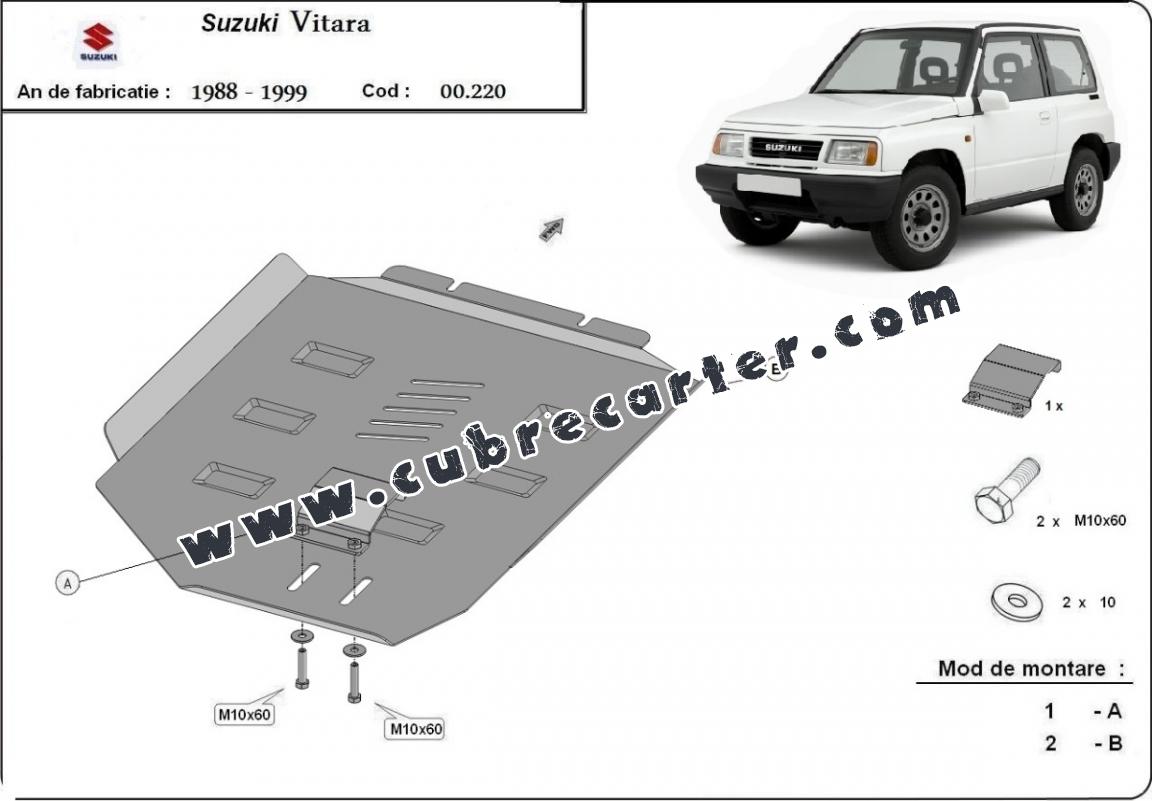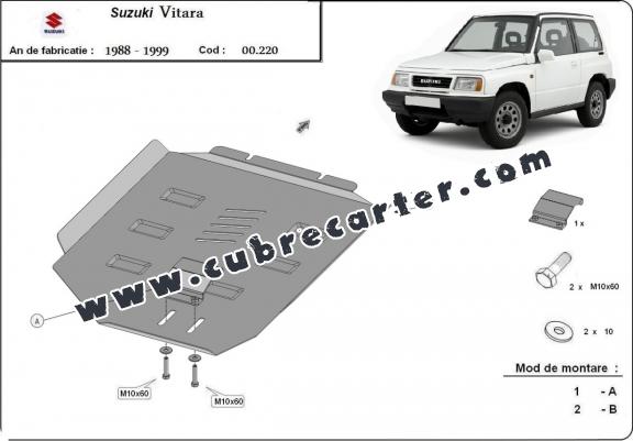 El cubre carter metalico es nuevo y se adapta perfectamente al Suzuki Vitara, con las siguientes versiones de motor / accionamiento: toate, fabricado entre 1988 y 1999. La placa protega los siguientes: caja de cambios Está preparado de chapa de Acero de 3 mm. Cerrojos, calces y todos los accesorios incluidos. Todas las placas son estrachadas con pintura de polvo anticorrosivo. Las placas del protección del motor son equipados con braceares soldados para resistir mejor a los impactos exteriores. |