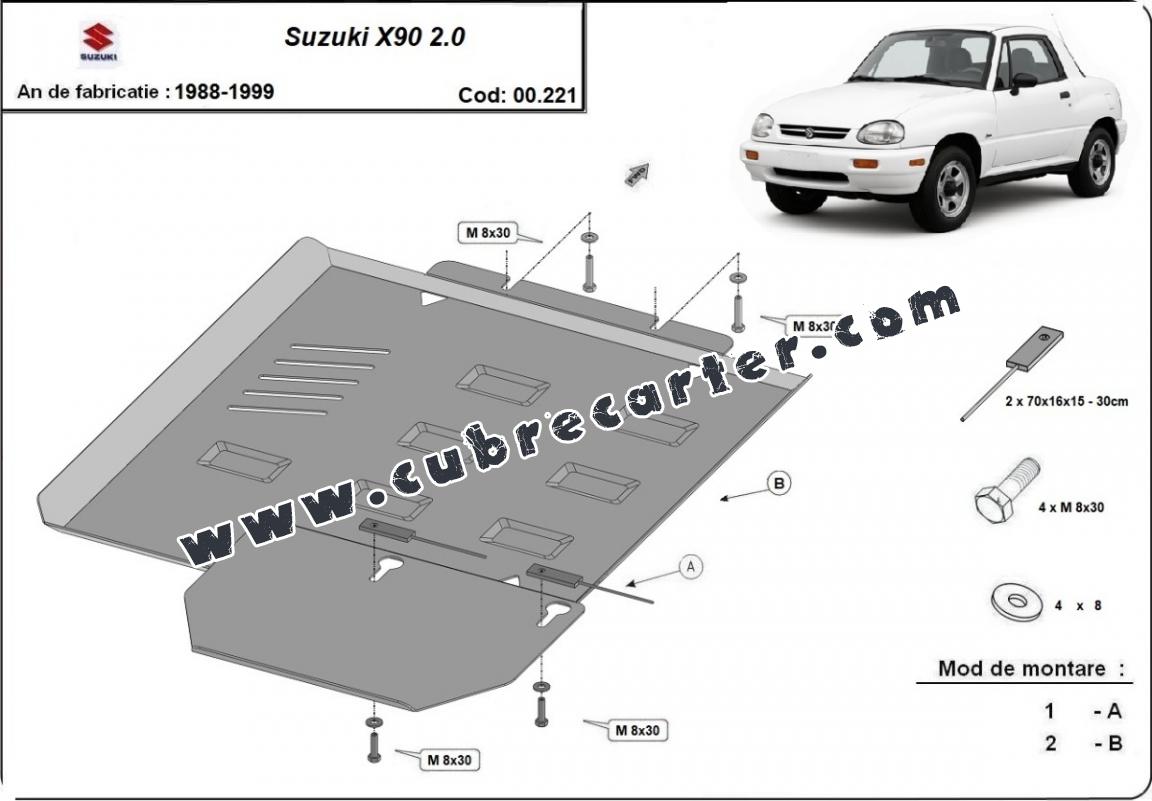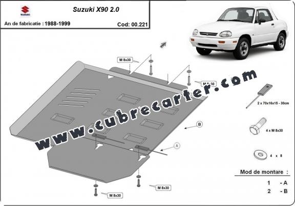 El cubre carter metalico es nuevo y se adapta perfectamente al Suzuki X90, con las siguientes versiones de motor / accionamiento: 2.0 petrol, fabricado entre 1988 y 1999. La placa protega los siguientes: caja de cambios, caja de transferencia Está preparado de chapa de Acero de 2.5 mm. Cerrojos, calces y todos los accesorios incluidos. Todas las placas son estrachadas con pintura de polvo anticorrosivo. Las placas del protección del motor son equipados con braceares soldados para resistir mejor a los impactos exteriores. |