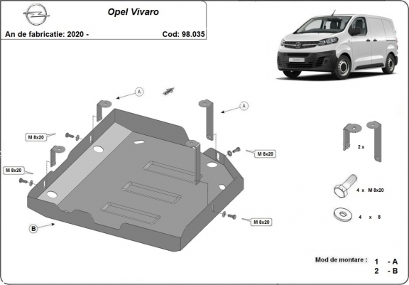 El cubre carter metalico es nuevo y se adapta perfectamente a todas las versiones de Opel Vivaro fabricadas entre 2020 y 2026. La placa protega los siguientes: depósito de combustible AdBlue Está preparado de chapa de Acero de 2 mm. Cerrojos, calces y todos los accesorios incluidos. Todas las placas son estrachadas con pintura de polvo anticorrosivo. Las placas del protección del motor son equipados con braceares soldados para resistir mejor a los impactos exteriores. |