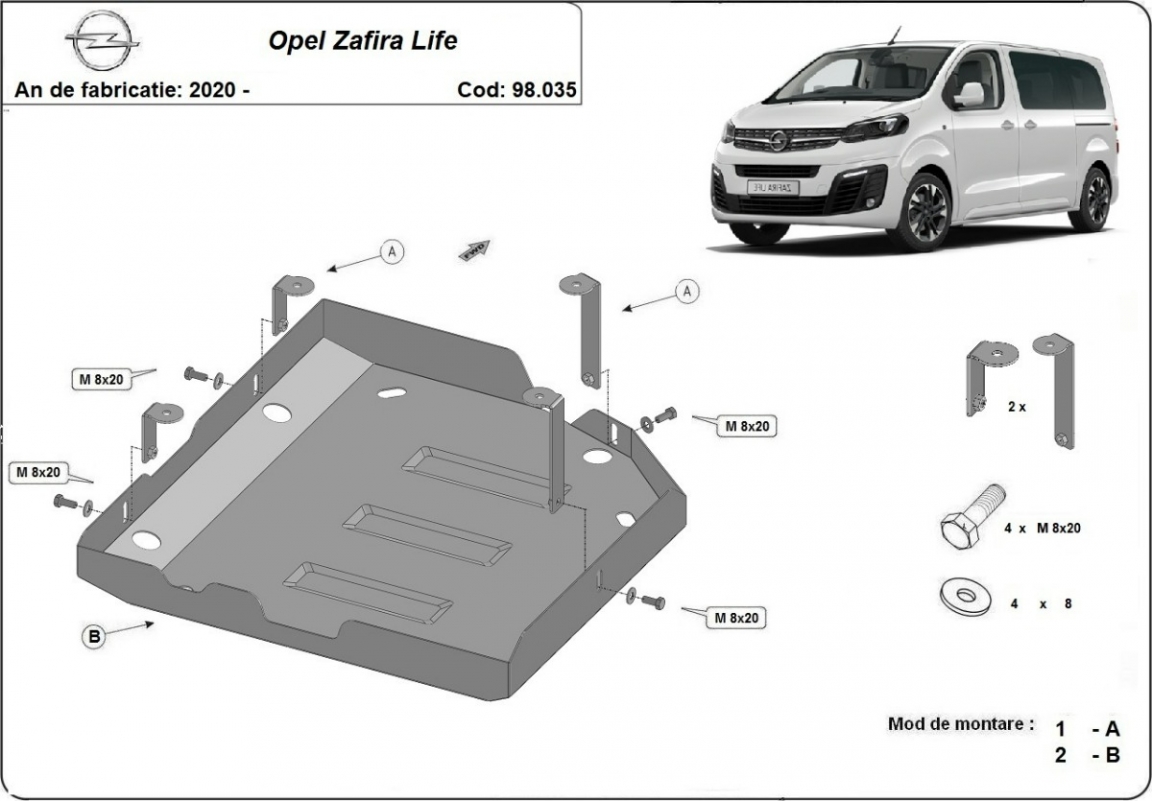 El cubre carter metalico es nuevo y se adapta perfectamente a todas las versiones de Opel Zafira Life fabricadas entre 2020 y 2026. La placa protega los siguientes: depósito de combustible AdBlue Está preparado de chapa de Acero de 2 mm. Cerrojos, calces y todos los accesorios incluidos. Todas las placas son estrachadas con pintura de polvo anticorrosivo. Las placas del protección del motor son equipados con braceares soldados para resistir mejor a los impactos exteriores. |
