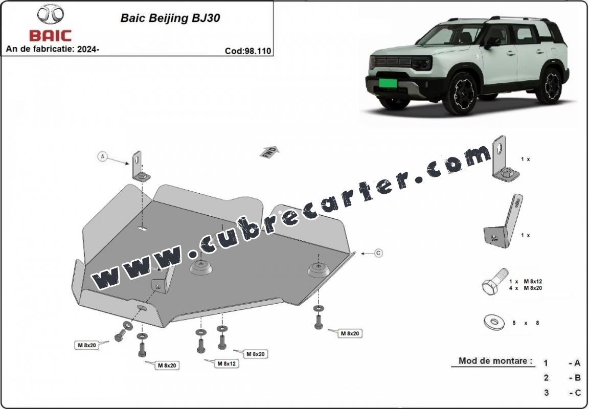 El cubre carter metalico es nuevo y se adapta perfectamente al Baic Beijing BJ30, con las siguientes versiones de motor / accionamiento: toate, fabricado entre 2024 y 2025. La placa protega los siguientes: diferencial trasero Está preparado de chapa de Acero de 2 mm. Cerrojos, calces y todos los accesorios incluidos. Todas las placas son estrachadas con pintura de polvo anticorrosivo. Las placas del protección del motor son equipados con braceares soldados para resistir mejor a los impactos exteriores. |