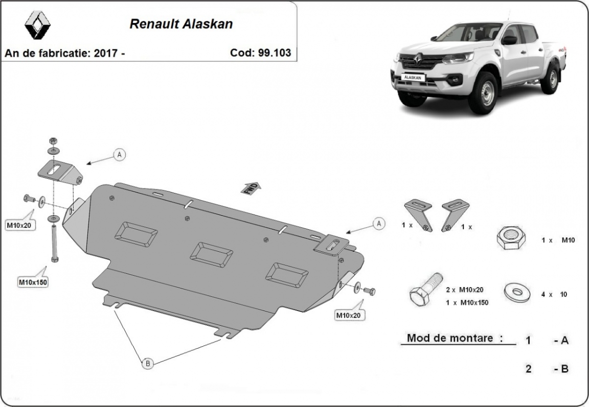El cubre carter metalico es nuevo y se adapta perfectamente a todas las versiones de Renault Alaskan fabricadas entre 2017 y 2026. La placa protega los siguientes: radiador Está preparado de chapa de Acero de 2 mm. Cerrojos, calces y todos los accesorios incluidos. Todas las placas son estrachadas con pintura de polvo anticorrosivo. Las placas del protección del motor son equipados con braceares soldados para resistir mejor a los impactos exteriores. |